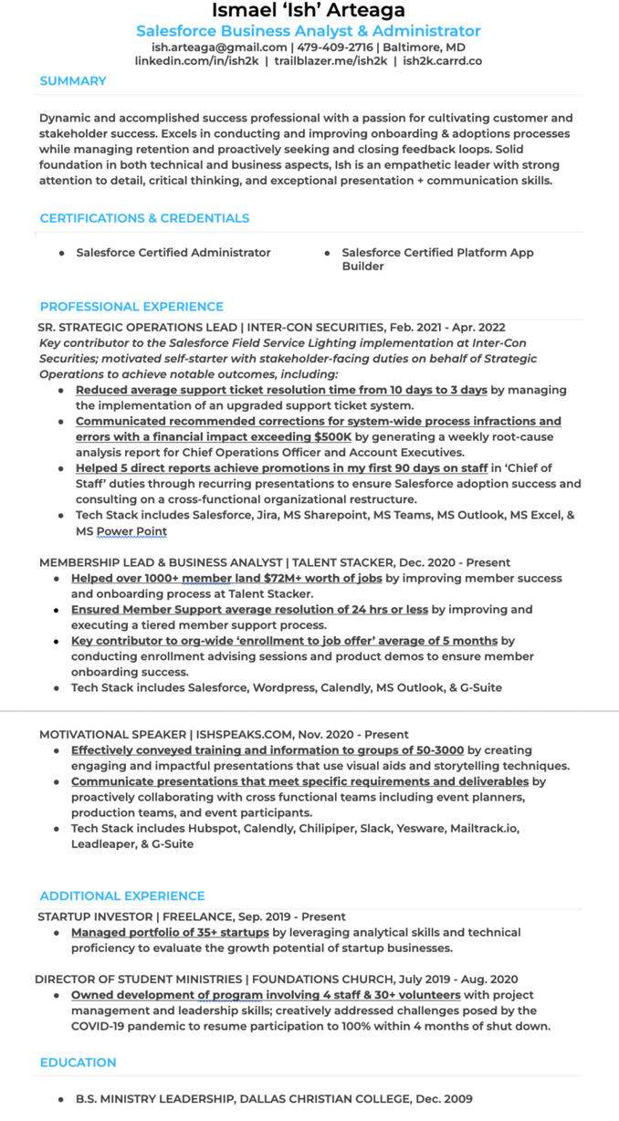 Ish is a dynamic and experienced Salesforce Professional with a strong background in communication, leadership, and Salesforce and a passion for cultivating customer and stakeholder success.Ish has been instrumental in an enterprise-wide implementation of Salesforce for a $3B+ company while partnering with another organization to help people land $72M+ in Salesforce job salaries, all while serving as an inspirational traveling speaker for student, young professional, and Salesforce audiences.